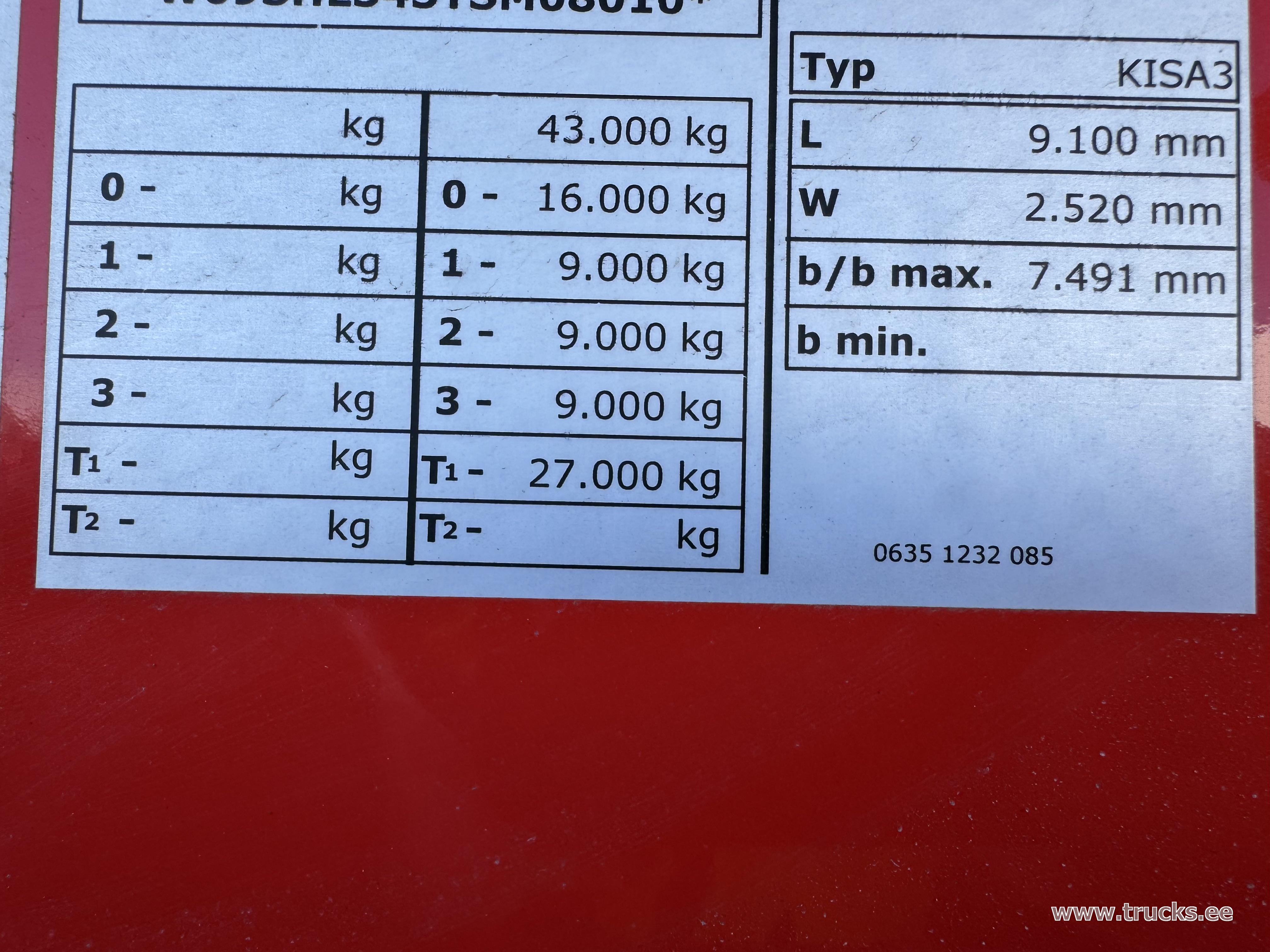 | Lisamärkused | HARDOX kast Seina paksus - 4mm Põhja paksus - 5mm Põhja paksus kasti tagaosas - 6mm Lubatud koormus haakeseadmele -16000kg Täismass - 43000kg |